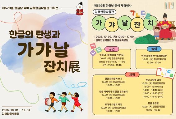 한방통신사 신유철기자 기자 | 김해시는 김해한글박물관이 제579돌 한글날을 맞아 ‘한글의 탄생과 가갸날 잔치’를 주제로 기획전시와 문화행사를 개최한다고 29일 밝혔다.