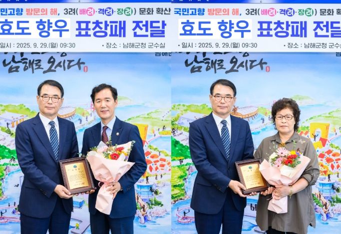 한방통신사 신유철기자 기자 | 남해군은 9월 29일 군청 대회의실에서 ‘효도 향우 표창패 전달식’을 열고, 고향을 잊지 않고 부모님을 모시며 3려 문화 확산과 고향사랑 실천에 기여한 향우에게 표창패를 전달했다.
