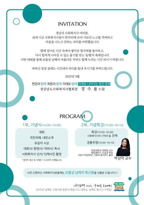 한방통신사 신유철기자 기자 | ‘제27회 경상남도사회복지사대회’가 오는 10월 17일 ‘함께 걷는 우리의 길, 동행’이라는 주제로 남해군에서 개최된다.