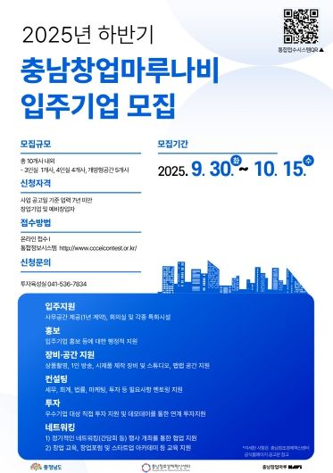 한방통신사 신유철기자 기자 | (재)충남창조경제혁신센터는 오는 10월 15일까지 2025년 하반기 충남창업마루나비 입주기업을 모집한다고 밝혔다. 이번 모집은 혁신적인 아이디어와 성장 잠재력을 지닌 스타트업을 발굴해 안정적인 보육 환경을 제공하고, 기업의 지속적인 성장을 지원하기 위해 추진된다.