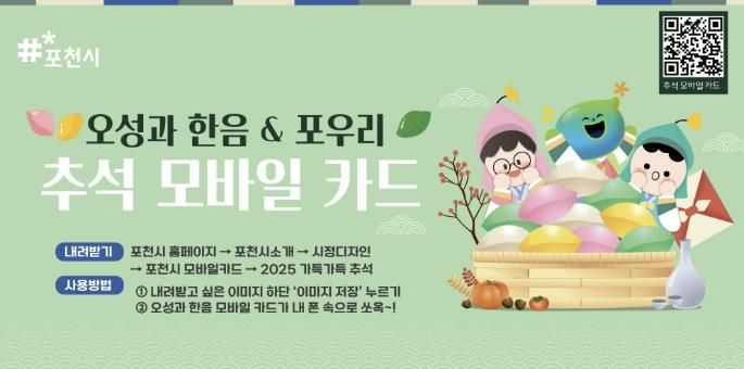 시 관계자는 “포천시가 준비한 모바일 카드로 소중한 분들께 따뜻한 마음을 전하고, 행복한 추석을 보내시길 바란다”며 “오성과 한음 모바일 카드가 시민 여러분의 명절을 더욱 따뜻하게 만들어 드리길 바란다”고 전했다.
