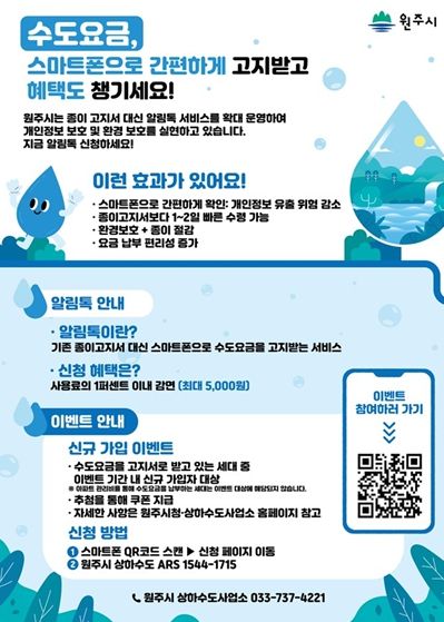 한방통신사 양호선기자 기자 | 원주시상하수도사업소는 ‘수도요금 알림톡 서비스’ 확대를 위해 10월 1일부터 12월 7일까지 신규 가입 이벤트를 진행한다.