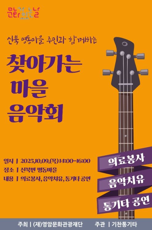 한방통신사 신다은기자 기자 | (재)영암문화관광재단은 2025 문화가 있는 날 행사지원 사업으로 생활문화 동호회인 기찬통기타(대표:최문일)와 함께 신북 명동마을 주민을 대상으로 한 ‘찾아가는 마을 음악회’를 오는 10월 9일 한글날에 개최한다고 밝혔다.