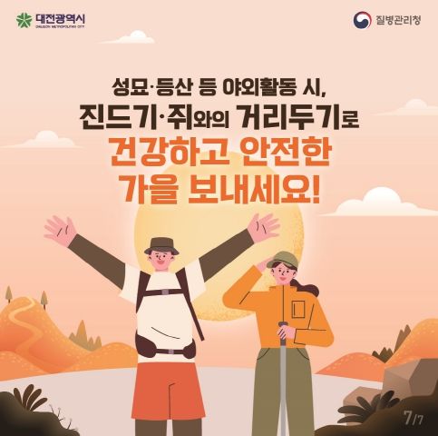 한방통신사 신태공 기자 | 대전시는 성묘와 등산, 농작업 등 야외활동이 늘어나는 가을철을 맞아 시민들에게 진드기·설치류 매개 감염병 예방수칙 준수를 당부했다.