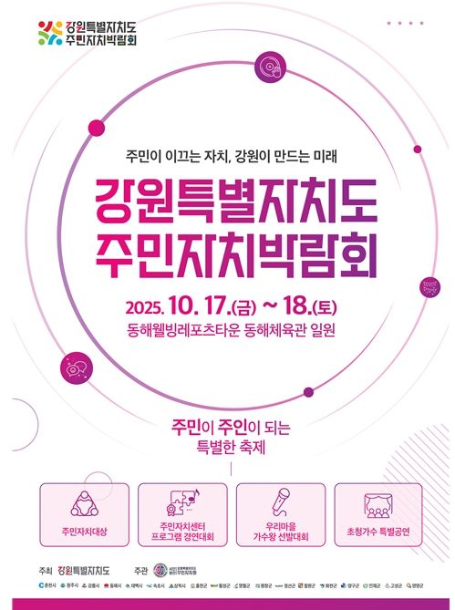 한방통신사 신유철기자 기자 | 강원특별자치도는 10월 17일부터 18일까지 동해시 동해체육관 일원에서 '2025 강원특별자치도 주민자치박람회'를 개최한다고 밝혔다.