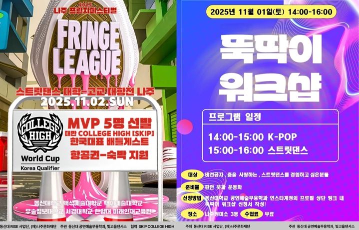 한방통신사 신다은기자 기자 | 나주문화재단이 청년 문화예술 활성화와 지역 문화도시 위상 강화를 위해 대학과 협력한 스트릿 댄스 프로젝트 ‘프린지리그’를 개최한다.