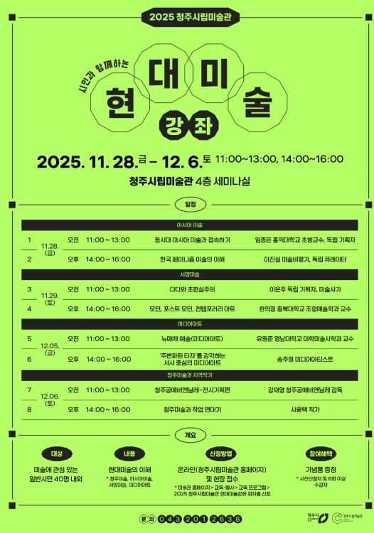 이번 강좌는 현대미술이 어렵게 느껴지는 시민들도 부담 없이 수강할 수 있도록 구성했으며, 아시아미술, 한국 페미니즘 미술, 서양미술, 미디어아트, 청주미술 등 다양한 분야에서 활발한 활동을 펼치는 전문가들이 총출동해 8회 강연을 진행한다.