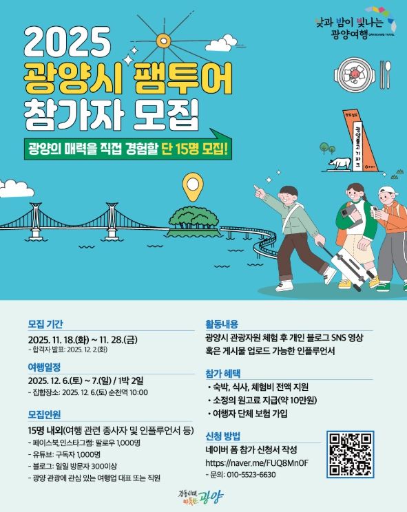 한방통신사 신다은기자 기자 | 광양시가 낮과 밤이 빛나는 광양의 매력적인 관광자원을 직접 체험하고, 감각적인 콘텐츠로 널리 홍보할 영향력 있는 ‘2025 G-관광 팸투어’ 참가자를 모집한다.