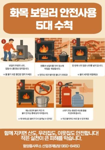 포스터에는 ▲입산통제구역 출입 금지 ▲산림 100m 이내 소각·취사 금지 ▲산불 발견 시 즉시 신고 등 기본 산불 예방 요령 ▲보일러 주변 정리 ▲연통·보일러 청소 ▲재 완전 소화 후 처리 ▲소화기 비치 등 화목보일러 안전 수칙이 포함되어 있다.