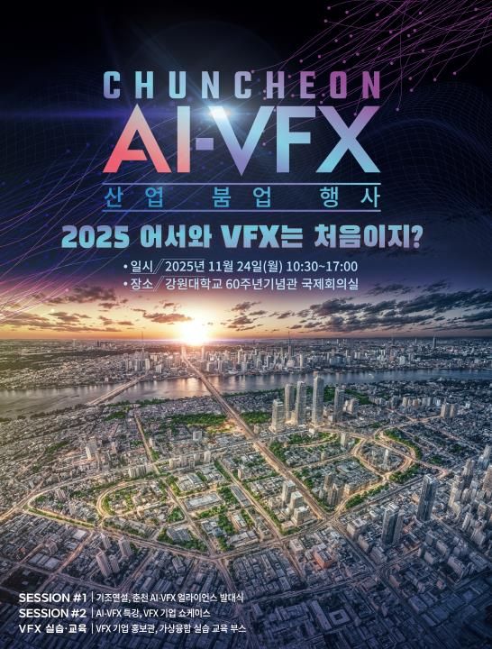 한방통신사 신유철기자 기자 | 춘천시는 2025년 11월 24일 강원대학교 60주년 기념관 국제 회의실에서 ‘춘천 AI-VFX 산업붐업행사 – 2025 어서와! VFX는 처음이지?’를 개최한다고 밝혔다.