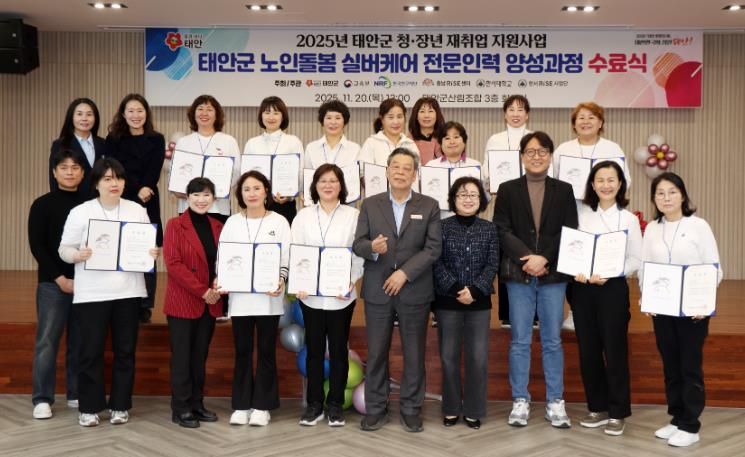 한방통신사 신태공 기자 | 태안군이 지난 20일 태안군산림조합 회의실에서 가세로 군수 등 군 관계자와 한서대RISE사업단 관계자, 교육생 등 20여 명이 참석한 가운데 ‘노인돌봄 실버케어 전문인력 양성과정 수료식’을 열고 총 12명의 교육생에게 수료증을 수여했다고 밝혔다.