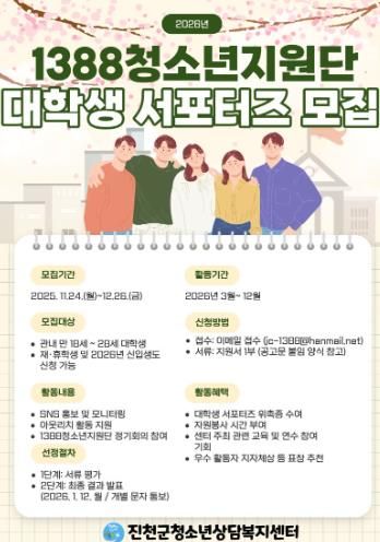 한방통신사 권영분기자 기자 | 충북 진천군청소년상담복지센터는 이달 24일부터 대학생 대상 서포터즈 프로그램 ‘2026년 1388청소년지원단 대학생 서포터즈’ 참가자를 모집한다고 밝혔다.