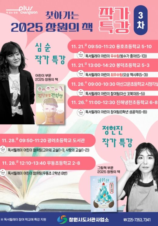 11월 21일에는 △봉덕초등학교(최우수팀 '오삼 책시루') △용호초등학교(우수팀 '빙수가 좋아!'), 11월 26일에는 △마산고운초등학교(참여팀 '마산 꼬북이') △진해냉천초등학교(참여팀 '6학년 성공적')에서 어린이 부문 선정도서 ‘감당 못 할 전학생’ 심순 작가를 만난다.