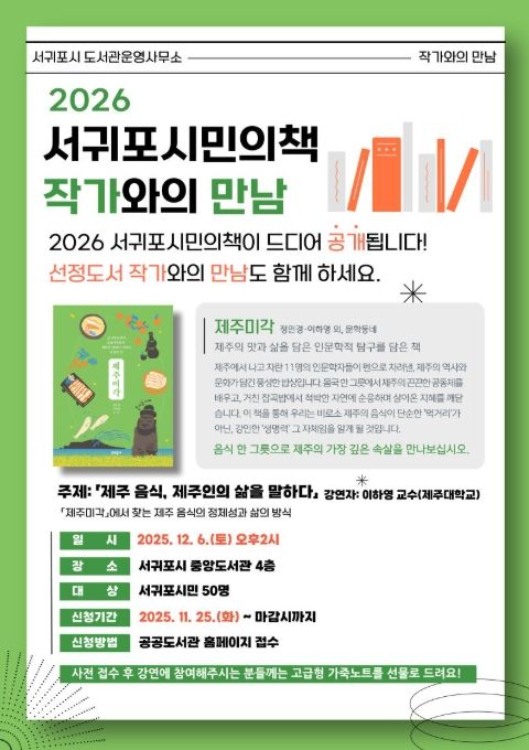 한방통신사 신유철기자 기자 | 서귀포시는 12월 6일 오후 2시, 서귀포시 중앙도서관에서 2026년 서귀포시민의 책으로 선정된 '제주미각'의 저자 이하영 교수를 초청해 작가와의 만남을 운영한다.