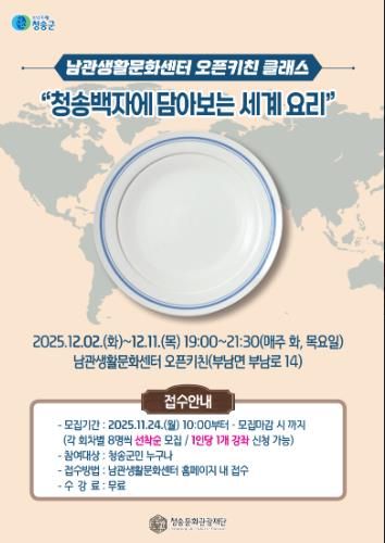 한방통신사 신유철기자 기자 | (재)청송문화관광재단은 지역 대표 문화유산인 청송백자에 세계 각국의 음식을 직접 만들어 담아보는 체험형 요리 수업 ‘청송백자에 담아보는 세계 요리’를 오는 12월 2일부터 11일까지 매주 화·목 저녁 7시부터 9시 30분까지 남관생활문화센터 오픈키친에서 총 4회 운영한다고 밝혔다.