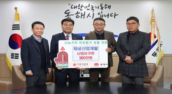 심규언 동해시장은 “추운 겨울을 앞두고 따뜻한 마음을 전해주신 태웅산업개발에 감사드린다”며, “기탁된 난방유 쿠폰은 도움이 꼭 필요한 가정에 신속하게 전달하겠다”고 전했다.