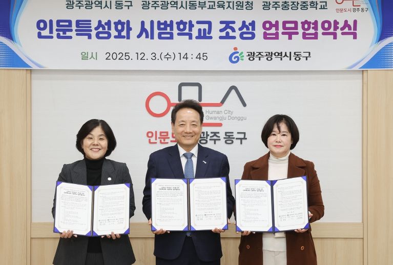 한방통신사 김성의 기자 | 광주 동구는 2026년 새롭게 기획한 인문특성화 학교 추진을 위해 지난 3일 광주동부교육지원청, 광주충장중학교와 ‘인문 특성화 시범학교 운영을 위한 업무협약’을 체결하고 지역 인문교육 활성화를 위한 협력 기반을 구축했다고 밝혔다.