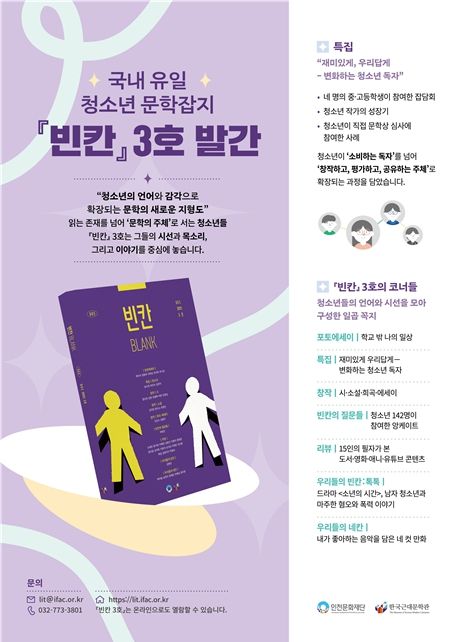 한방통신사 신유철기자 기자 | 인천문화재단 한국근대문학관은 국내 유일의 청소년 문학잡지 [빈칸] 3호를 발간했다.