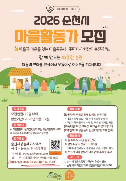 선발된 마을활동가는 2026년 1월부터 12월까지 순천시 관내에서 활동하게 된다.