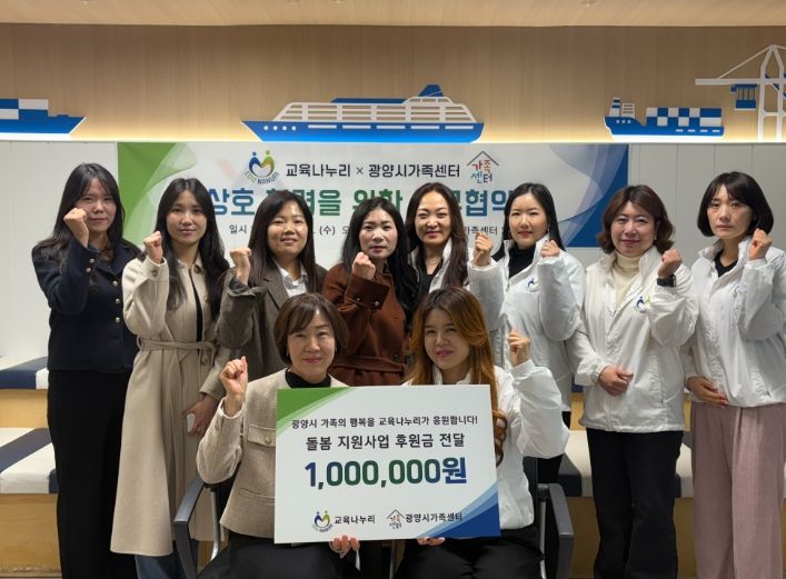 협약식과 함께 열린 후원금 전달식에서는 교육나누리가 광양시가족센터 돌봄지원팀에 후원금 100만 원을 기탁했으며, 해당 후원금은 가족 대상 돌봄지원사업인 ‘공동육아나눔터’ 프로그램 운영에 활용될 예정이다.