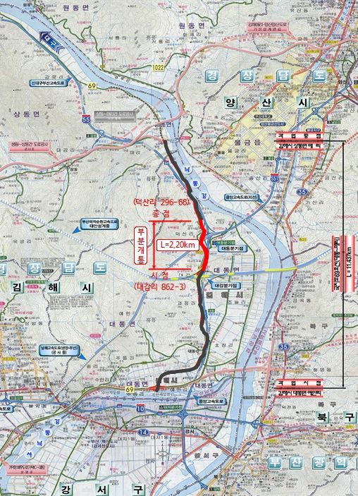 이번 개통 구간은 경상남도에서 추진 중인 국지도 69호선(대동~매리) 건설공사 구간 중 1단계 구간으로, 감내교차로~신암교차로를 연결하는 연장 2.2km 구간이다.