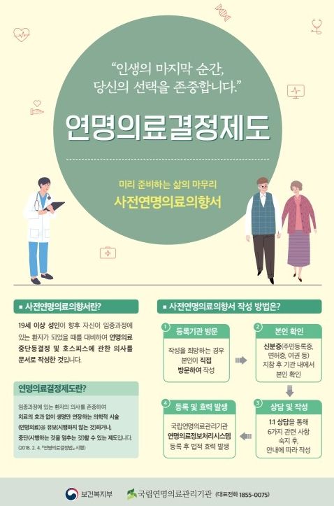 사전연명의료의향서는 임종 과정에 있는 환자가 연명의료 시행 여부와 호스피스 이용 등에 대해 본인의 의사를 사전에 문서로 남기는 제도로, 19세 이상 성인이면 누구나 신분증을 지참해 등록기관을 직접 방문하여 작성할 수 있다.