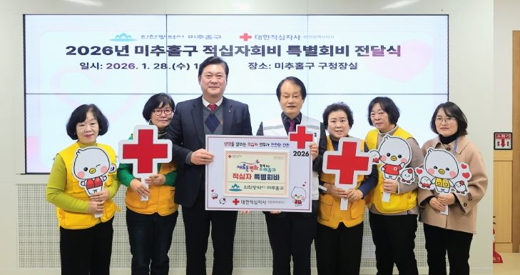 한방통신사 신유철기자 기자 | 인천 미추홀구는 28일 구청장실에서 대한적십자사 인천지사(회장 조의영)와 적십자봉사회 미추홀구협의회(회장 조혜정) 등이 참석한 가운데 적십자 특별회비 200만 원을 전달했다.