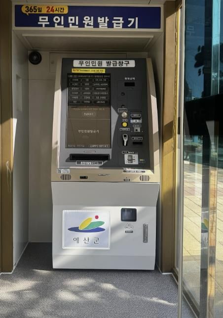 한방통신사 신태공 기자 | 예산군은 지난 26일 예산군청(실외)과 예산읍(실외)에 설치된 노후 무인민원발급기 2대를 교체했다.