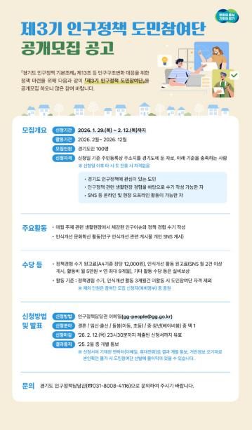 한방통신사 신유철기자 기자 | 경기도가 정책 대상자가 직접 정책개선에 참여하는 ‘제3기 인구정책 도민참여단’ 100명을 공개 모집한다.