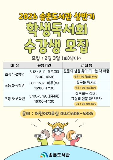 한방통신사 신태공 기자 | 대전 대덕구 송촌도서관은 어린이들의 올바른 독서 습관 형성과 창의적 사고력 증진을 위해 ‘2026년 상반기 학생독서회’ 수강생을 모집한다.