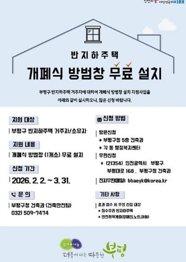 지원 대상은 부평구 내 반지하주택 거주자(소유자)이며, 방범창 설치는 전액 무료로 이뤄진다.