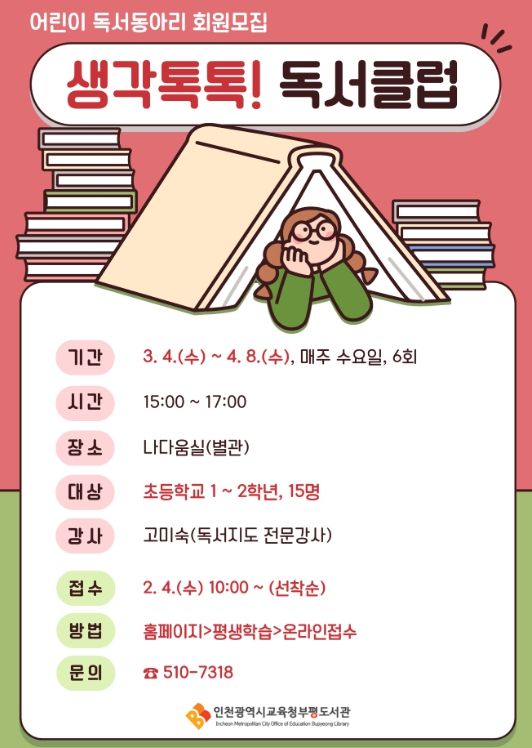 한방통신사 신유철기자 기자 | 인천광역시교육청부평도서관은 3월 4일부터 4월 8일까지 2026년 상반기 어린이 독서동아리 ‘생각 톡톡! 독서클럽’을 운영한다.