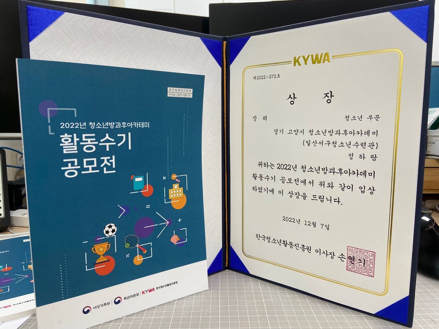 고양시청소년재단(이사장 이동환) 일산서구청소년수련관 방과후아카데미 ‘라온꿈터’에서는 한국청소년활동진흥원에서 주최한 ‘2022년 청소년방과후아카데미 공모전(우수사례, 활동수기)에 참여하여 활동수기 부분에서 진흥원 이사장상을 수상하였다.
