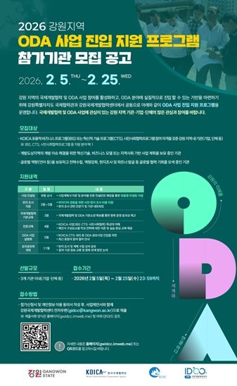 강원특별자치도와 강원국제개발협력센터는 도내 기업 및 기관의 해외시장 개척과 글로벌 경쟁력 강화를 위해 2월 5일부터 25일까지 '2026 강원지역 ODA 사업 진입 지원 공모사업' 참여기관을 모집한다.