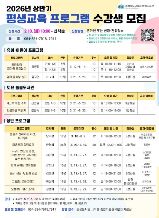 한방통신사 신유철기자 기자 | 경상북도교육청 의성도서관은 지역주민의 평생학습 기회를 확대하고 삶의 질 향상을 도모하기 위해 2월 10일(화)부터 상반기 평생교육 프로그램 수강생을 모집한다고 밝혔다.