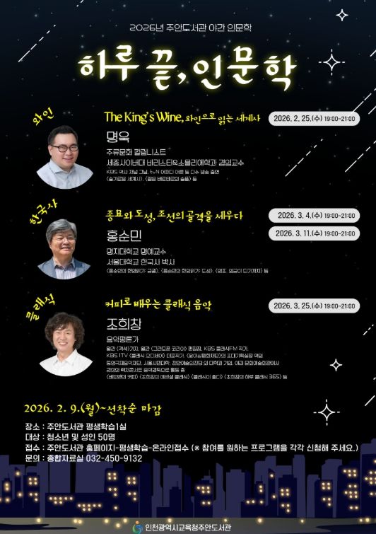 한방통신사 신유철기자 기자 | 인천광역시교육청주안도서관은 2월부터 3월까지 시민들이 다양한 인문학 주제를 접할 수 있는 야간 인문학 프로그램 ‘하루 끝, 인문학’을 운영한다.