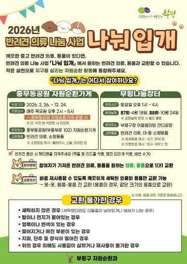 ‘나눠 입개’는 2026년 부평구가 새롭게 추진하는 자원순환 사업으로, 사용하지 않는 반려견 의류와 용품을 주민 간에 교환함으로써 폐기물 발생을 줄이고 자원순환 실천 문화를 확산하고자 마련됐다.