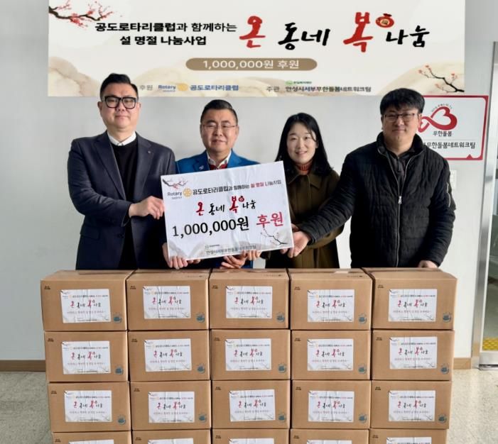 한방통신사 신유철기자 기자 | 사회복지법인 한길복지재단이 수탁 운영하는 안성시서부무한돌봄네트워크팀은 국제로타리 3600지구 공도로타리클럽과 지난 12일 설 명절 나눔사업 ‘온동네 복나눔’ 후원금 100만 원 전달식을 가졌다.
