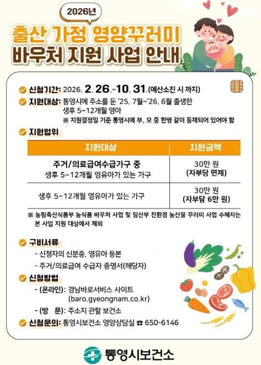 한방통신사 신유철기자 기자 | 통영시는 영아의 건강한 성장·발달 도모 및 출산 가정의 경제적 부담을 완화하기 위해 2026년 신규사업으로 '출산 가정 영양꾸러미 바우처 지원사업'을 시행한다고 24일 밝혔다.
