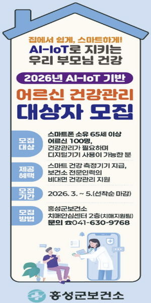 한방통신사 신태공 기자 | 홍성군은 어르신 만성질환 예방과 건강한 노후 생활 지원을 위해 ‘2026년 AI·IoT 기반 어르신 건강관리사업’의 참여 대상자 100명을 모집한다고 밝혔다.