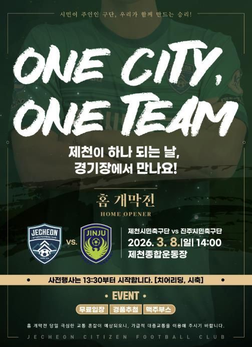 제천시민축구단 안성국 대표이사는 “이번 홈 개막전은 시민 모두가 함께 만드는 축구 축제가 될 것”이라며, “가족, 친구와 함께 경기장을 찾아 뜨겁게 응원해 주시길 바란다”라고 말했다.