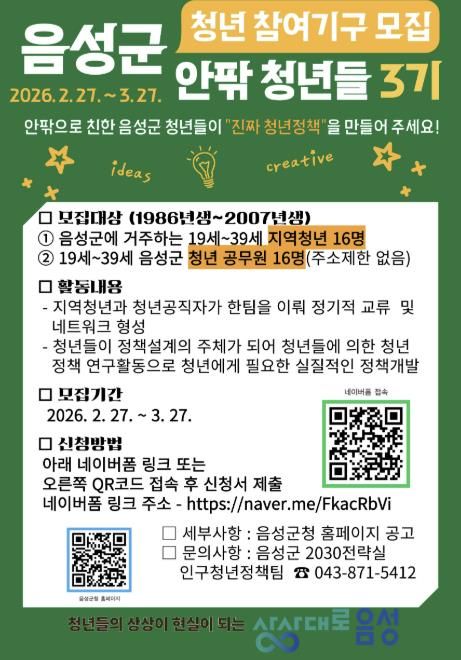 참여 신청은 오는 3월 27일까지 음성군 홈페이지 공고문에 게재된 QR코드를 통해 신청서를 제출하면 된다.