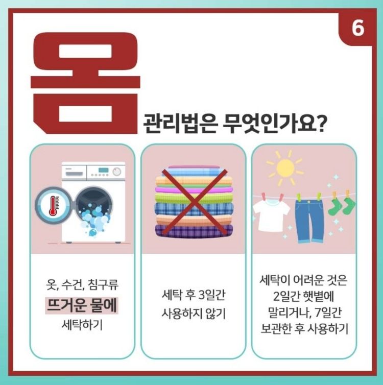 특히 옴 예방을 위해서는 환자와의 피부 접촉을 최소화하고 손 씻기 등 개인위생을 철저히 하며, 침구류와 의류, 수건 등은 고온으로 세탁하여 청결을 유지하는 것이 중요하다.