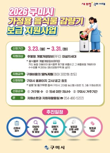 한방통신사 신유철기자 기자 | 구미시는 음식물류 폐기물 관리 사각지대를 해소하고 배출 편의를 높이기 위해 ‘가정용 음식물 감량기 보급 지원사업’을 추진한다.