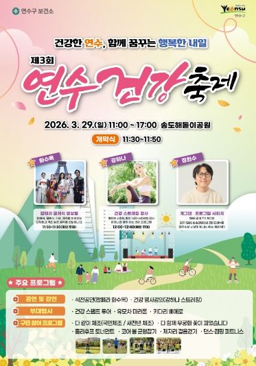 한방통신사 신유철기자 기자 | 연수구는 오는 3월 29일 송도해돋이공원 잔디광장 일대에서 구민 누구나 참여하고 즐길 수 있는 ‘제3회 연수 건강축제’를 개최한다.