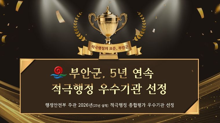 한방통신사 김성의 기자 | 부안군은 행정안전부에서 주관한 2026년(2025년 실적) 지방정부 적극행정 종합평가에서 우수기관으로 선정돼 지난 2021년 하반기 성과 점검부터 5년 연속 우수기관 선정이라는 금자탑을 쌓았다고 밝혔다.