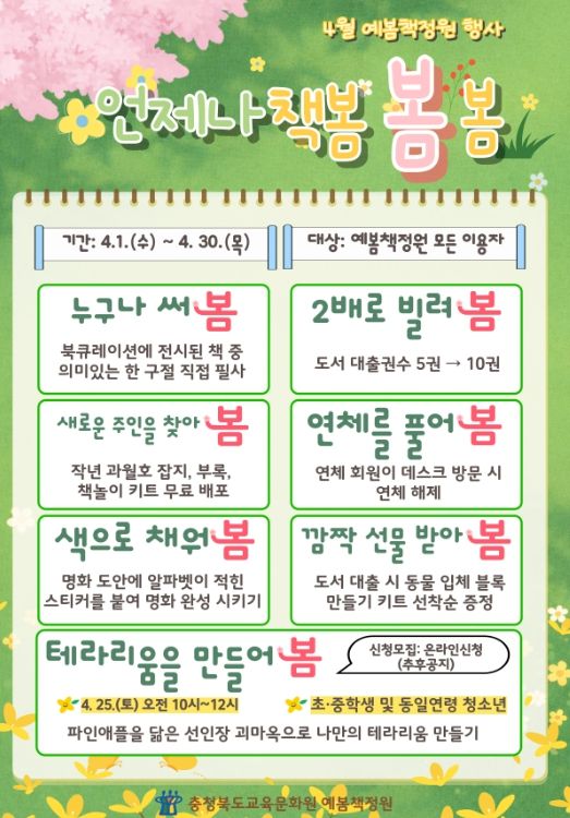 한방통신사 권영분기자 기자 | 충청북도교육청 직속기관 교육문화원은 예봄책정원에서 충북 도민들이 책과 함께 따뜻한 봄을 만끽할 수 있는 독서행사 '언제나 책봄‧봄‧봄'을 4월 한 달간 운영한다.