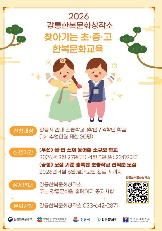 한방통신사 양호선기자 기자 | 강릉한복문화창작소는 2026 찾아가는 초중고 한복문화 교육에 참여할 초등학교를 모집한다.