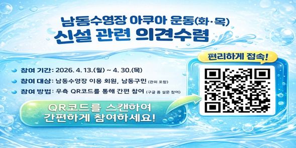 공단은 프로그램 신설에 앞서 이용자 의견을 반영하기 위해 오는 4월 13일부터 4월 30일까지 약 3주간 의견 수렴을 실시한다. 설문은 남동수영장 이용 회원뿐 아니라 남동구민 및 관외 이용자 누구나 참여할 수 있으며, 공단 홈페이지 및 수영장 게시판, QR코드 기반 온라인 설문을 통해 진행된다.