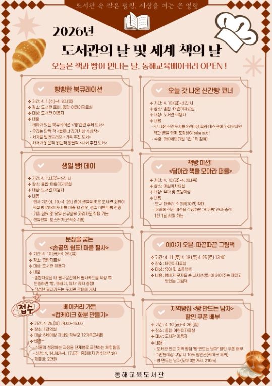 한방통신사 양호선기자 기자 | 동해교육도서관은 4월 12일 도서관의 날과 4월 23일 세계 책의 날을 맞아 ‘오늘은 책과 빵이 만나는 날, 동해교육베이커리 오픈(OPEN)!’을 주제로 지역주민과 함께하는 독서문화 행사를 운영한다.